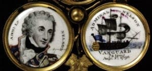 In contrast, the companion medallion of Nelson's Flagship with 74 guns, the Vanguard, gives emphasis to the transfer printed message and outlines, with sketchily applied colours.