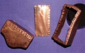 The bases of these wares were of copper foil, up to 0.6 mm (about 0.02 in.) in thickness. This kept material costs low and simplified the metal shaping.