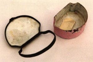 The transfer of the stipple design requires the use of a bat: this is a layer composed of a mixture of warmed gelatine and treacle, which solidifies and holds to this surface the residuum of the oil in the engraving. For this, the drying of the copper plate and bat is by placing the plate at an incline against the sides of a warm oven, and as the gelatine bat dries it detaches and with this "popping off', it carries the oily design. The bat is then applied, image side down, on the enamel surface, and rubbed over with a cotton pad, to make the transfer. While still sticky the oily image is dusted over with finely powdered pigment, and the fine portraits that could be produced with this technique were seldom overpainted (Pic. 8).