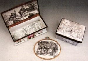 English enamels made during the period 1750 to 1840 were chiefly ornamented with transfer printed images and mottos. While the most important innovations in this manufacture were connected with these transfer processes, other new working systems were needed to make this output profitable.