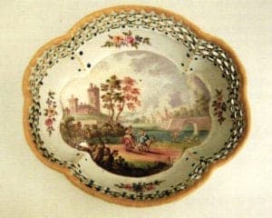 The wares coated so speedily by dipping could seldom match the grounding produced with traditionally laid enamels, but the ease of preparing shaped objects and the costing factors outweighed this. For ornate effects in any case only small areas of white were left showing, as much was masked with broad coloured borders surrounding the central transfer printed designs (Pic. 6). After the 1780s, thousands of very low cost trinkets and souvenir items were made that were given simple motifs, often with borders omitted.