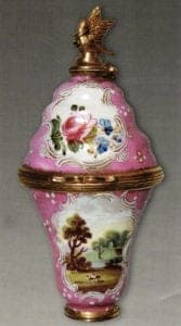 It seems that for the English enamels the gilding method was similar to the hazardous mercury gilding in standard use at the period for metal: for this mercury and gold dust were amalgamated and applied by brush where wanted, followed by gentle re-heating to fume off the mercury, leaving the film of gold dust attached to the enamel.