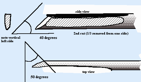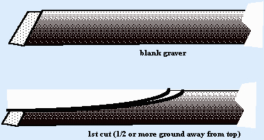 Oval graver. An oval graver (no. 6 is good for starting) should be ground to shape. When the handle rests in the palm of the hand and the steel against the ball of the thumb, it should stick out about 1-1.5 cm beyond the end of the thumb. When grinding an engraving tool, cool it very frequently. Any colouring of the metal means loss of temper and the ruin of the coloured area. The left side is ground back about 3 cm and about halfway across the tool to the middle. The top is then ground down about a third of the height of the graver. Any sharp edges on the top are rounded slightly. The front angle is cut on the grinding wheel and then by hand on the oilstone. (7.0).