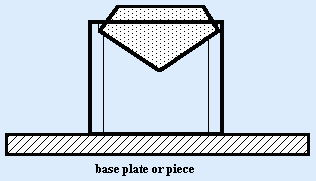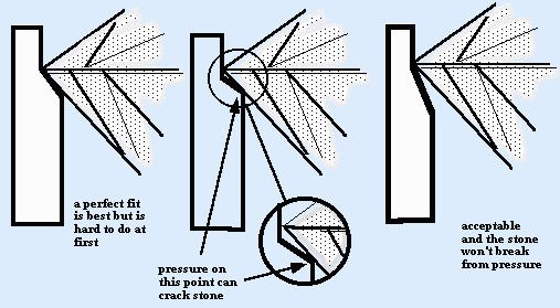 The situation to avoid is when the seat is a shallower angle than the pavillion of the stone and this results in pressure on the stone when the wall is hammered down onto it during setting. This pressure often cracks a stone. Acceptable, easiest and fastest is to have the angle greater than the pavillion (exagerated slightly in the drawing that follows). This places no pressure on the stone and ususally results in a satisfactory setting. (5.1)