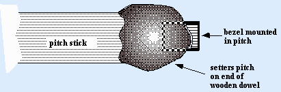 Pitch stick. A wooden dowel about 2.5 cm in diameter and 12-15 cm long. The pitch melted onto the top is hard setters pitch, too hard to be dented with a fingernail and not too brittle. The setting is heated and pressed into the previously softened pitch. (Do not burn pitch while heating it.) It may be rapidly cooled in water if necessary. The pitch should be smooth and not bumpy. This is for comfort in working as will as for safety, as lumpy pitch may break under pressure (6.0).