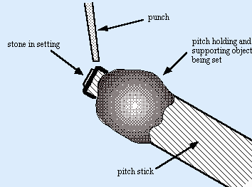Chasing hammer and a vise or engravers ball to clamp the pitchstick in during setting. A panavise works well. I like a Benchmate® system for holding things for setting. The pitch however does the best job of supporting the metal during the setting procedure. Setting punches. These are about 10 cm long and hardened. The edges are rounded slightly. There are other shapes available for different setting purposes (7.3).