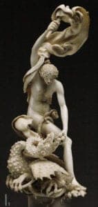 When the paintings and sculptures of Rudolph Kanns came up fro auction in Paris in 1907, the young American art dealer Joseph Duveen took out a loan of five million US dollars to acquire the entire collection. Duveen proved to have had a good eye for business. In 1939 he sold two unusual ivory statuettes from the collection. One of them embodied a fury, galloping, a cry on its lips, astride a white horse. The second statuette is a seated, naked man, unmistakably related to the fury. His mouth is opened wide in a cry of lament, the wide-spread arms seeking hold.