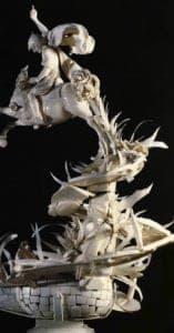 What drove the Master of the Furies to address precisely this awkward topic so often? Was it an early Baroque fascination with horror that he depicted in his perfect ivory works? His most exciting piece is dedicated to the sacrificial death of the Roman warrior Marcus Curtius, who plunged to his doom on his horse in 362 BC to save Rome from destruction. The 46 cm high masterpiece comes from the Medici collection in Florence. A total of 25 works are attributed to the artist. The carver pushes the material to the limits. Wafer-thin leaves twist up like threatening flames, bent under the application of steam. The plinth that spirals upwards is a mosaic of ivory work, composed of 250 pieces and plates. The masterpiece represents the high point of the works discovered to date. Scarcely any other artist of that era managed to capture the mannerisms of extreme human feelings as adeptly.