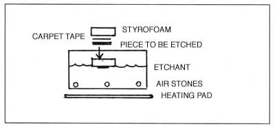 2. Ferric Chloride . This is the mordant I am most familiar with. Though it is messy, it is much less toxic than nitric acid and gives a nice, even, albeit slower, etch. It will work on copper or brass, but not on silver. (See Ferric Nitrate listed below for a similar etchant for silver.) I find that a slightly diluted FeCl 3 solution works as well as, or better than, the full strength stuff. Three cups of 42 degree F Baume Ferric Chloride mixed with one cup of water is recommended. As ferric chloride etches, it can leave a layer of sediment on the exposed copper, which acts as a barrier to further etching. To counteract this, I etch my pieces upside down - stuck to a piece of styrofoam with carpet tape. The whole kit and caboodle can be removed from the bath to rinse it off, which you should do often, and then returned to float in the vat of ferric chloride. The etching rate can be enhanced in three ways: by agitation, aeration, and heat. One of the simplest ways to achieve the first two is to use an aquarium pump and 'bubble wands'. The latter are a type of air stone for fish tanks that look like thin tubes of turquoise styrofoam. (Air stones made from glass particles work for a while, but then the glue that holds them together breaks down and they crumble.) Attach the bubble wands to the bottom of your container with electrical tape so that the bubbles pretty uniformly cover the entire area. I have used a homemade spray etching machine, which definitely speeds up etching time, but I have not been able to control the etch sufficiently - parts of the piece etch all the way through before others are etched enough! Depending on the shape and material of your container, heat can be applied with fish tank heaters, a heating pad, a hot plate, a heat lamp, or even a Luxo type lamp. Watch the temperature very closely. You don't want to go over 175 degrees F, or your PnP resist will fail to resist and asphaltum will be long gone. Heating will cut your etching time almost in half, but be forewarned that it also produces harmful fumes and weakens your resist. Proper ventilation is important, and mandatory if you are heating this solution.
