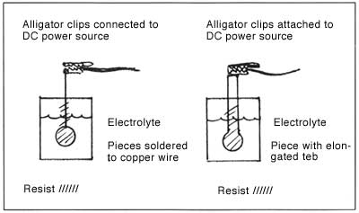 This means that even very thin lines will not disappear as you etch. I guess the major drawbacks to electro-etching are that it is not easy to do multiple pieces at one time and that you need to have some extra equipment, namely a source of DC power: dry cell batteries, a car battery, a transformer or a rectifier, and an electrical connection to your piece. I used a plating rectifier set at 1.5 volts and my pieces were done in 2-3 hours. At this point, I only know of two ways to attach the pieces to the DC power source. If you don't want to waste any metal, then you would cut your piece to the exact size of your design and soft solder a copper wire to the back (before applying any resist there) and attach an alligator clip to the wire outside of the solution. The back side of the piece and lower part of the wire that will be in the electrolyte need to be painted with a resist or they will etch away. If you don't mind wasting some metal, you can leave a tab at one end of the piece that will remain bare of resist and be attached to the power source with an alligator clip outside of the solution. (See illustrations.)