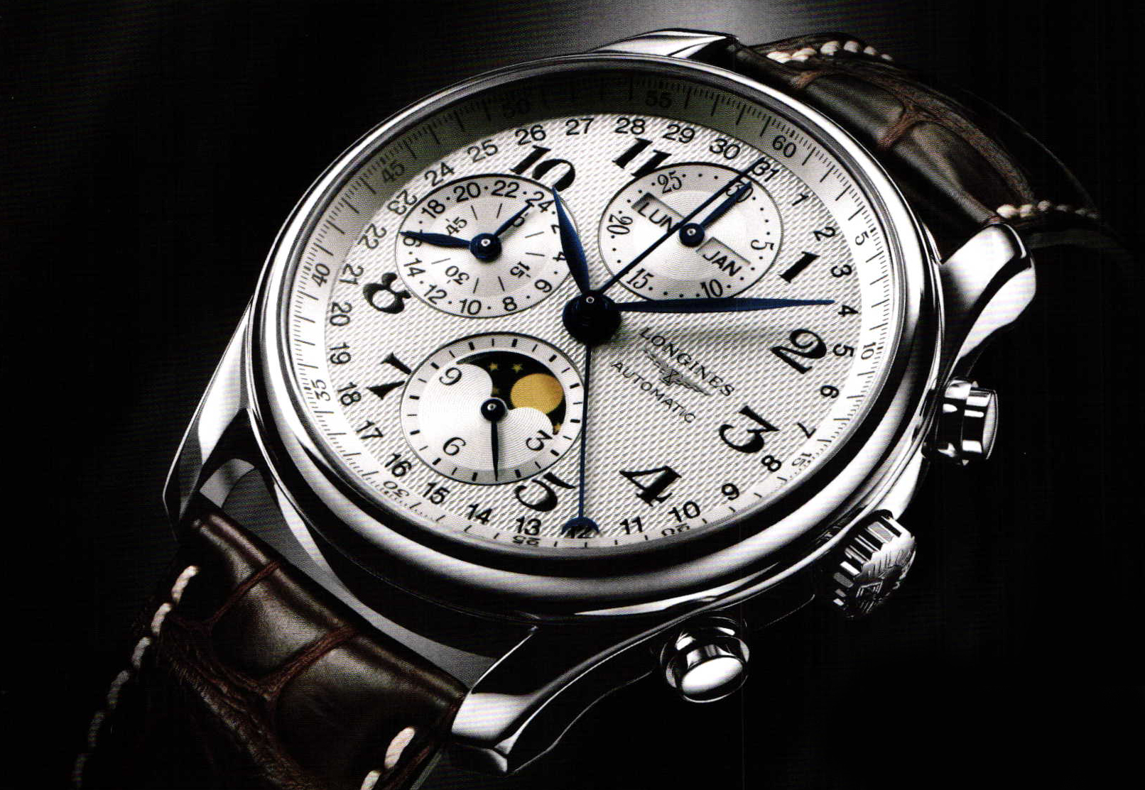 A display of moon phases on wrist watches is a particularly charming solution. It portrays the different appearances of the moon over the course of a moon month. This complication was already found in watches during the Renaissance period and is a frequent bedfellow for calendar displays. It takes place entirely realistically using a circular, gold-plated symbol against a dark blue background on a disc, which - coupled with the clock's date display - rotates. Within this framework, the moon symbol runs across a semicircular section of the dial and shows the individual phases of the ascendant or descendant moon, new moon and full moon. Discerning wristwatches prove particularly precise here: for example, the "L.U.C Lunar One" by Chopard deviates from the moon's cycle by just 57.2 seconds, or one day every 122 years. Only the most renowned of watch manufacturers manage that.