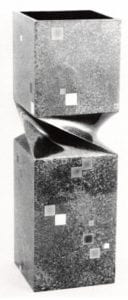 Traditionalism and an indebtedness to the past do not go unchallenged in the Kyoto Exhibition. Hideaki Yamamoto's cast brass vase, with inlays of silver, copper, shahudô, and, shibuichi, expresses the dignity of the past and contains an awareness of twentieth-century design. At first glance it could be a ceramic piece until the finesse of folded metal which separates the upper square from the lower rectangle becomes apparent. From some angles, the shadows seem to sever the upper portion of the vase from the bottom