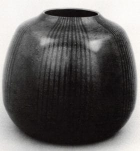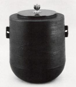 Many of the metal designs by the Kyoto craftsmen direct attention to symmetrical perfection, glowing patinas, the enamel-like colors with their changing iridescences, and to feats of technical virtuosity. There are, however, in the exhibition some reticent pieces with tranquil monochromatic values which are not "captive to perfection." There is, for example, a handsome cast iron tea kettle by Jirôbe Takagi, a fourth generation ironworker. Not content to learn only the process of casting, Takagi studied under three painters and spent two years of apprenticeship under the direction of a metalsmith in order to learn hammering and engraving techniques.