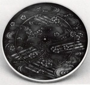 The making of bronze mirrors is a specialty of Shinji Yamamoto and his sons. At the age of 15, Shinji Yamamoto began to receive instruction in mirrormaking from his father. One of Yamamoto's traditional mirrors is shown here. It is of cast bronze with mercury amalgum. The design on the back is called the raft and chrysanthemum pattern. Nine years ago, the designs in metal by Shinji Yamamoto were designated Intangible Cultural Properties by the Japanese government. Mr. Yamamoto's son, Fujio, recreated for the exhibition an old Japanese mirror at Nara; its origin was carefully researched by Fujio and a professor at the University of Kyoto.