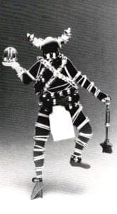 Among the Hopi after the summer snake dance ends, the wriggling reptilian bundles are taken to the foot of the mesa and then released to carry the Indian's request for rain to the Supernaturals. Snakes of mirrored chrome, their serrated bodies wound with colored wire and beads, are among the southwestern Indian motifs crafted by Jill Elizabeth. Her koshare dancer pinpoints the intensity and action of the participants in the ceremonials held in the pueblo plazas.