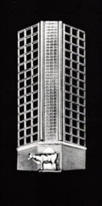 To the cowboy as subject, James Robson added the cow in the landscape. For an artist living in western Canada, Robson points out, "It is impossible to ignore the ever present 'landscape paintings.' The strength of this tradition is perhaps . . .due to the relatively late settling and cultivation of the land." In this country of open spaces, Robson's cows stand out in high relief. One occupies the middle of a road that disappears into infinity; another pushed to the end of a fence. But in Well, Maybe One More Cow, a bovine creature, like the bull thundering through Wall Street in a well-known TV commercial, has invaded the "stock market." This cow is content to stand in the shade of a tall office building hopefully waiting to be discovered.