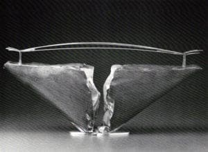 Robert McCall's Interior Landscape also conveys a contemplative mood. The format is an inverted triangle. Smaller triangles have frequently appeared in McCall's designs with the impact of projectiles shooting across a surface to heighten tensions. In this, the effect is quiescent and dreamlike. Forming the vortex of the triangle, there is a polished metallic cow's skull, with curving horns repeated in the tips of a crescent moon, which rides above on a patch of sky. A field of textured metal suggests the imagery of cow's hide. It supports a framing device that discloses a series of points, gleaming like a prairie fire or the serrations of mountain peaks. There is a temptation to read symbolic meanings in McCall's metal statements, but without benefit of the artist's own words, it is safest to brand this brooch as a powerful and provocative abstraction.