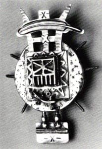 The pictoglaphs and petroglyphs left on the walls of Pre-Columbian rock shelters of New Mexico and Arizona have supplied symbolic imagery for modern metalsmiths. Combining metals designs with a collage of old coins, bones, ivory, vertebrae, found objects and talismans, Susan Silver Brown constructs sculpture as "wearable art." To Brown, a spiral symbolizes the cosmos; a feather suggests spiritual flight; while a lizard becomes "the representative of man's chameleon like and ever changing nature." In the tradition of the shaman/artist, Brown does not consider her jewelry as just something "with which to adorn the body," but she relates it "to man's fate and destiny."