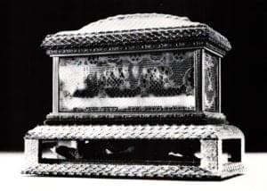 Another menace to hikers along western trails has been decently put to rest by Betsy Crump. Funeral Rattle #4 preserves a rattler's tail in a reliquary of gleaming copper, mother-of-pearl and glass walls, neatly curtained with lace. Commenting on this memento mori, the artist says, "By using the rattlesnake rattle, I compare our own fear but reverence for snakes with similar feelings toward death."