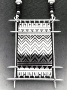 Terri Lee Foltz Fox is another metalsmith drawn to "the mystery and mythology of the primitive arts." Working with married metals—sterling, copper, nickel and brass—she recognizes the dichotomy that exists between controlled technological skills and that "magnetism and spirit" found in Indian and African arts. Similar contrasts are present in Fox's juxtaposition of simplified forms with surfaces covered by a complex patterning. A pendant in the form of a loom illustrates the harmonious resolution of these tensions. The loom is a tightly constructed frame, a utilitarian object that has changed little in structure for millennia. In contrast, the design attached to the loom answers a need for intricate and repetitive patterns that Fox believes can induce "visual meditation and contemplation."