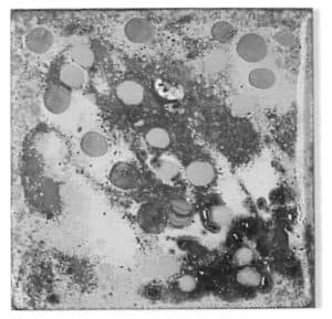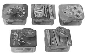 Usually I'll do a set of four in one color with slightly different treatments. Four can be fired on one 4″ mesh trivet. On these small things I leave the back bare. On arrival from the supplier, these are bright and shiny, though very oily. Rather than clean off the oil, I paint with baby oil instead of KIyr Fire, and sift a heavy coat of opaques. With tweezers I pick up beads, threads, or lumps and lay them in place. . .the oil doesn't even have to dry. You'll hear a small pop soon after placing in the kiln, but nothing is disturbed. I fire in a small kiln (a Jelrus) at 1500°F for about 90 seconds. After filing the edges, they're ready to be glued to a magnet. If I planned to add silver foil, I used to first fire my color-two thin coats as taught, that's two firings-then add foil, fire that, then sift transparent over and fire again-that's four firings. I began to wonder why I couldn't do that all at once. . .there should be a quicker way. I cleaned the top of my small trial piece with spit and a tiny bit of powdered enamel on paper towel to degrease the surface, brushed on a heavy coat of Klyr Fire®, sifted a heavy coat of enamel. . .then using an eyedropper filled with diluted Klyr Fire® (1/2 water), dripped drops onto the powdered enamel until wet enough to be shiny. (Hold the eyedropper about 1/8″ above the surface and space drops next to one another so they spread and touch; until the whole piece is wet enough to be shiny but not puddle or drip.) This is very important! Then using tweezers, laid the silver bits in place and carefully smoothed them with a small soft damp brush. This may not be necessary if the foil lies smoothly where you want it. Then I sifted 2020 flux over the foil, very thinly, placed lumps, threads, floral buttons or whatever where desired. Allow to dry on top of the kiln then fire as usual-voila! You'll be surprised. . .and I hope, delighted. This method does take some practice but saves much time and electricity. One time, a piece done this way was left overnight to dry, and the next day I noticed that the foil had curled up a little in places. . .fired it anyway to see what would happen and it came out quite well. This was a fragile and complicated bit of silver design and where the foil had lifted, it curled over itself and I could pick off the loose bits with tweezers. This piece was done early on, before I learned to use the diluted Klyr Fire instead of just water to wet the piece just before adding the foil. This piece can be saved with another firing.