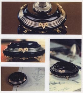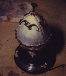 When it came to designing the details go over the egg shell, I wanted a more contemporary form. At the same time I wanted a recognizable classic theme. I chose a simple scroll form, similar to the acanthas leaf pattern but without the details. This was curved in wax, and then cast in eighteen karat yellow gold. This would contrast well with the now chosen, deep red color the egg shell would ultimately take on. Now a design was needed for the center seam between the upper and lower halves. A Luarel Branch pattern was selected. Rendered in Sterling Silver, bound in eighteen karat yellow gold wraps in an X pattern and terminated alternately with Ruby and Black Jade cabacheon stones, this center band was divided into six segments. The purpose was to be far more than simple decoration.