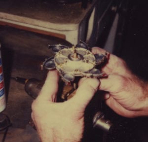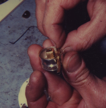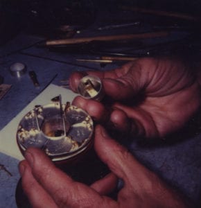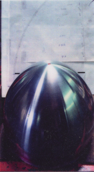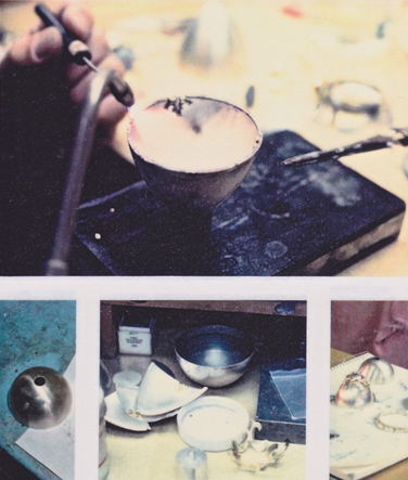 The metal is alternately heated and cooled until any warpage or tension is eliminated. After this process the surface is worked with successively finer abrasives until it is ready to polish. Now the two halves of the shell are set aside and creative energy is put into the outside embellishments.
