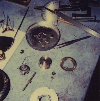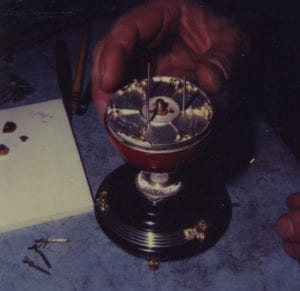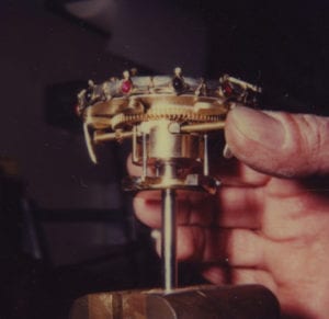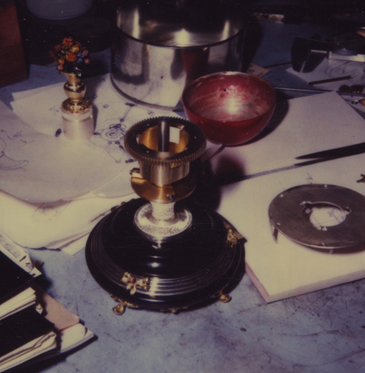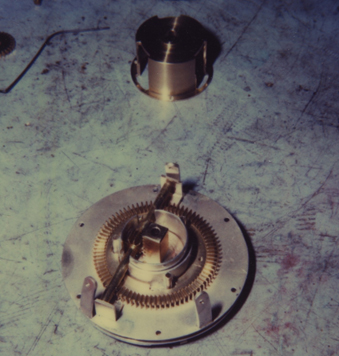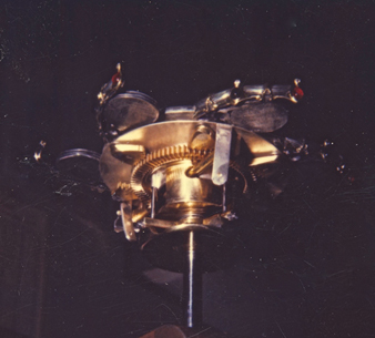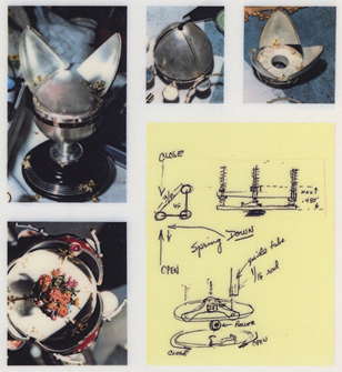 Chris designed a rack and pinion gear set to raise the pedestal that supported the flowers and vase. This mechanism in turn had to be linked to the previously created pushrods, so as the egg shell unfolded, the flower vase would raise up twelve millimeters to become the central theme. By creating a piece with active mechanics, I felt we had now achieved something beyond simply mimicking Fabrege's style. I asked Chris if he could open the side panels with the miniature family portraits with the same mechanism but… slightly delayed. A surprise within a surprise. Chris's imagination, knowing no boundaries, envisioned a large, radially cut gear with two mating surfaces, and a series of triangular gears attached to each of the picture frames. This complex piece of machining works flawlessly. Again, all of this was tied into the previous mechanism to allow actuation by a simple push of the jeweled lever.