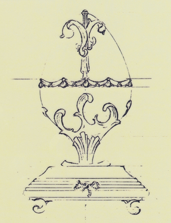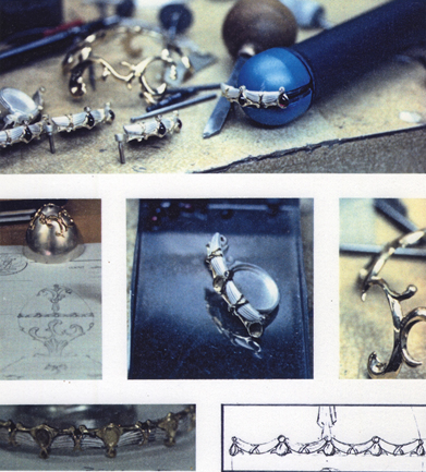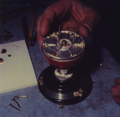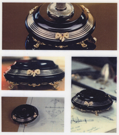 The intention was to have the egg shell open in three segments at the top, while exposing a flower vase (eighteen karat yellow gold) holding the appropriate flowers of the month for each of the family members birthdays. This vase of flowers was not merely exposed by opening the egg, but raised to a position of prominence as the shell was unfolding. Added to this was the emergence of six miniature oil paintings of the family members contained in the Laurel Branch detail at the Meridian of the egg. All this was exposed with one push of a jeweled lever at the base of the black jade. The mechanism Chris and I created is one of the hidden marvels of this piece. It is totally concealed in the bottom half of the egg shell. Of course a process like the creation of the mechanics were it not broken down into components.