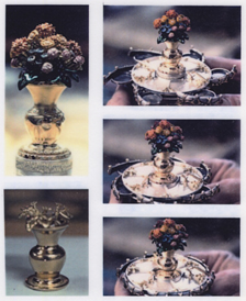 Separating the two pieces of Jade are multiple graduated rings of Sterling Silver, accented by three bows of eighteen karat green old, pave set with small Russian cut diamonds. The bottom of the base is elevated by four eighteen karat yellow gold feet, carved in a simplified scroll pattern. I've been extremely fortunate to have the friendship of one Christian Eric Thundstrom. Chris's mechanical ingenuity was certainly tested to its fullest when I presented him with my design for the surprise. While most of Fabrege's pieces pictured surprises that were for the most part static, the piece we'd created was very active. It was created to blossom, so to speak.