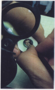 I became acutely aware of a missing element. We needed an artist capable of capturing the personality of the family. Fortunately, I've had a long-standing friendship with one of the country's finest artists, Phil Roberts. Phil, while teaching anatomy at Otis Parson's Art Institute, has also enjoyed a successful career in sculpture and portraiture among the movie industry. Using photographs of the family, Phil constructed miniature oil paintings on 22 karat gold discs. These paintings are a mere 13.5 millimeters in diameter. The fabricated disc was then underpainted with a brown sienna value study followed by the delicate application of skin tones. Each finished disc is then sealed under a varnish to forever protect the life and color of these images. Given the nature of this egg, celebrating the family Hack and Ryoko had created, Phil's miniatures artfully captured this moment in time in the finest quality of classic portraiture.
