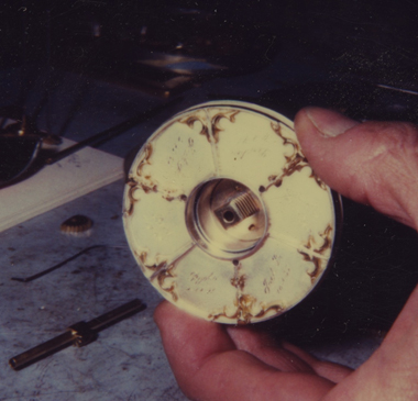 Chris is blessed with another talent. His wife, Kathleen works side by side with Chris in their mainstay business which is the restoration of Antique Music Mechanisms. Her primary focus is the restoration and re-detailing of the wood cases, also repainting the scenes and panels that embellish them. We put her to work on the flowers of course. Choosing enamels, both opaque and translucent, Kathleen captured the color and subtlety of the originals beautifully. I have a profound satisfaction in seeing and watching the finished creation operate. I sometimes wonder what Peter Carl Fabrege would say about this modern day team of artisans, walking his footsteps. To give all this some kind of "time perspective" Jack and Ryoko's anniversary egg project took just under one year to complete. There are over 1800 individual components that were fabricated, and there is not a single nut, bolt or component that was not handmade. To say that we were challenged is an understatement. It has been the project of a lifetime.