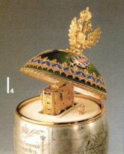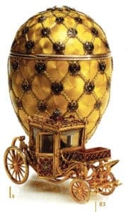 Kollin was also credited with having developed the idea of combining the traditional Russian Easter customs with the art of goldsmithing. Master jewelers Perchin and Wigström subsequently applied this idea to the expensive eggs. In total, 56 of these eggs were produced in gold, enamel and gemstones and contained, amongst other things, a golden coronation carriage, castles, a ship, a Trans-Siberian train, a chicken and many other miniature surprises hidden inside, all perfectly formed down to the very last detail.