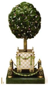 The pieces are between 9 and 12 cm high and can be opened like a can. This ingenious perfection even extends as far as one of the eggs appearing in the form of an orange tree. Pressing on one of the fruits reveals a tiny nightingale which can beat its wings and even sing. Fabergé's gold-enameled peacock can also move its head and fan out its tail while a tea rose bud piece folds out to reveal a crown set with diamonds and rubies.
