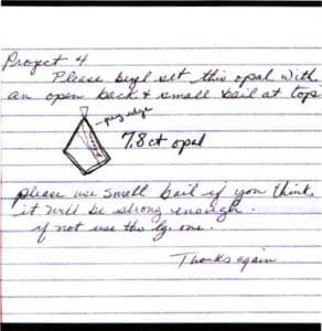 I received this opal from a woman who had cut it years ago. Her customer was aware it had a small chip on the corner and she was leery of setting it. I wasn't sure if it had been kept hydrated or if it was more brittle that usual. She also wanted a light weight pendant mounting that hid the damage to keep from having to re-cut it and the subsequent weight loss. This was my initial design info for the free form opal pendant: