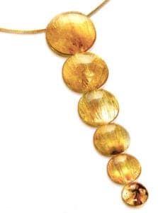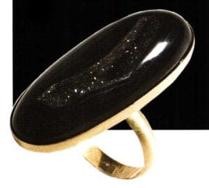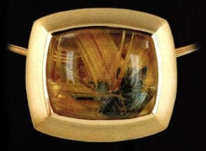 Rutile is one of the most frequent and still most interesting inclusion minerals, found throughout the world in host in the most varying of qualities, forms and colors. Rutile is present most frequently in quartz as fine, yellow, often chaotically arranged needles, which are also known as Venus hair. However, rutile can also have a red color or, in rare cases, can even be in the form of a mysterious looking, 6-pointed star. These coincidental and natural arrangements can appear so perfect that Jürgen Schneider, for example, was once asked by trade fair visitors whether he had installed the inclusions in the quartz by some technical means Cathrine Clarke from Brazil has also some of these spectacular stones with rutile needles as jewelry stones and used them to create the collection "Sun Dance". She drew her inspiration for this from Brazil's tropical light, which mirrors the manifold variety of the South American region "Sun Dance" consists of brooches, pendants, rings and earrings, in which Cathrine Clarke uses imperial topaz and rutile quartz, which "accentuate the innate characteristics of each gem, as in nature nothing repeats itself", says the Brazilian.