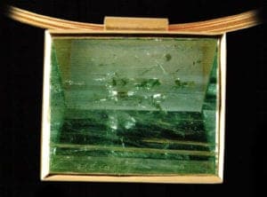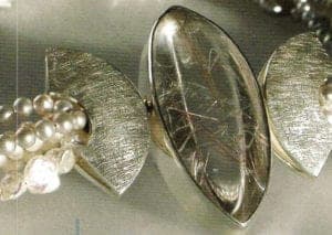 Mountain crystal, amethyst or aquamarine with various inclusions, such as rutile or goetite needles and hematite and pyrite inclusions are increasingly winning over admirers in contemporary jewelry design. The Pforzheim-based master goldsmith Jürgen Schneider quite deliberately processes stones with inclusions and impurity in his "modern jewels". Cut to simple, geometric forms and set simply, he emphasizes the special beauty of the unique stones "Among aquamarines in particular, I find stones with an 'innerlife' far more interesting than the perfectly pure crystal", says Jürgen Schneider. The jewelry designer and master goldsmith from Bochum, Gudrun Meyer, also prefers to use interesting gemstones in her chains and rings, she sees them as very personal, natural works of art. The design of the jewelry around the stone is reserved and sparing in order to emphasize the effects of the gemstones. She has the gift of making the mountain crystal cabochons with the most varied of inclusions appear extremely vital and exciting.