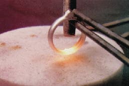 As soon as the fusing takes place, gradually move the torch around the shank, continuing with the procedure; this creates a complete metallurgical bond. (Be sure you weld the inside of the shank as well.) Once this is completed, you can clean the ring with a file.