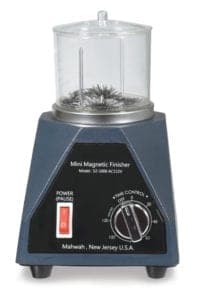 With a motor designed to operate at 1,800 rpm, the Mini Magnetic Finisher can be used to burnish and clean one to five rings in less than 30 minutes. Equipped with a hard, acrylic 80 mm bowl, the finisher has magnets embedded under the bowl that change polarity, causing a centrifugal action that allows the burnishing pins to get into recessed areas, slots, and channels. Featuring a compact footprint of 5.5 inches wide by 5.5 inches deep by 9 inches high, the finisher has a direct-drive, fan-cooled motor for quiet operation, an on/off switch, and a 0 to 120 minute timer for easy operation. In addition, it comes with 50 grams of 0.5 mm stainless steel burnishing pins. Contact: Paul H. Gesswein & Co. Inc., 201 Hancock Ave., Bridgeport, CT 06605; 1-203- 366-5400; fax 366-3953; e-mail info@gesswein.com; gesswein.com.
