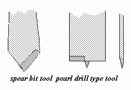 By taking a broken burr, annealing it, forging it and filing, then re-tempering to a light yellow on the tip and blue everywhere else, one can make a nice tool to bore holes for stone settings. It functions like a 'pearl drill' and looks like a miniature carpenter's spade bit. It cuts a flat bottomed hole. Remember to use care when tempering and always use safety goggles when using machinery. Another antique drill style is a 'spear bit' and like the pearl drill it is still available from European tool dealers. Both are quite fast cutting and offer some advantages over normal burs for some operations. In China goldsmiths take umbrella spokes, forge and shape them as spear bits for pump drills (bow drills). I actually learned stonesetting with a pump drill-the slow speed has advantages in fostering understanding of the process.