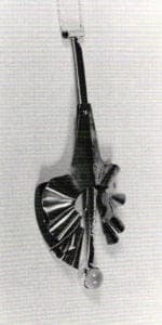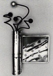 The jewelry that followed in the 70s represents a period of great energy, exploration and assimilation, as she established the foundation of her current work. Stones disappeared for a time, as metal gained even greater importance. Combinations of metals included bronze, the metal of choice in most of her sculpture and containers. Bronze with silver, silver with copper, and chrome plating over silver with copper, all indicated a quest for color that was achieved mainly without stones, or with dyed plastic elements. In some instances contrast was obtained by a confrontation between a graceful, refined form and one of seemingly artless, awkward immediacy.