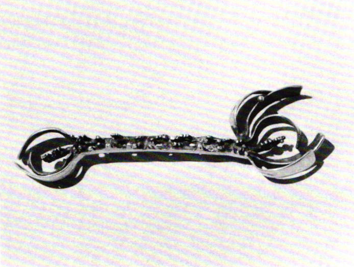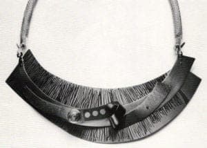 Echoes of her recurrent search for color are found in some of the densely patinated cost silver, gold or alloyed pins of the 50s and color retains its importance with the introduction of dyed, cast resins into her work of the 60s. In a less obvious manner, it may be found in the nuances of color and value differentiations that she gained by combining various cast, plated or electroformed metals with sheet and wire.