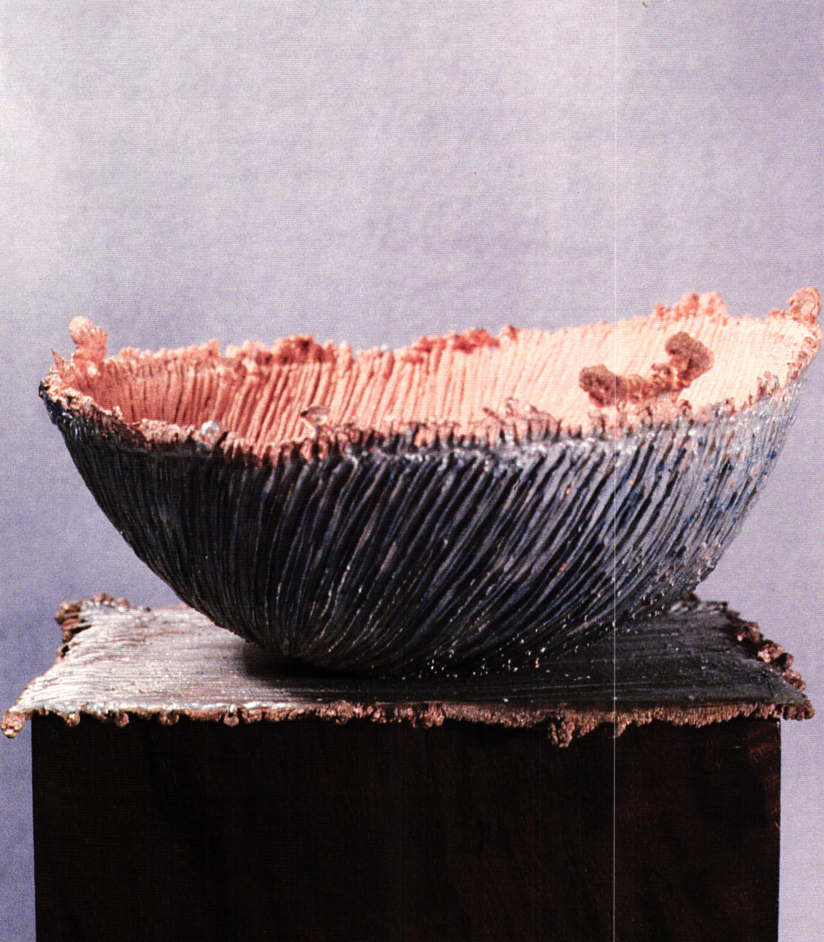 She also believes that we can be informed by and enjoy the contributions of other cultures without borrowing irrelevant symbols, and that we can learn from them and our own cultural past without having to romanticize their methodologies. It is not surprising, then, to find in her studio machinery that replaces some traditional hand procedures, nor is the equipment to work with highly refractory metals a negation of her identity as an artist and creator of unique objects. That her recent work incorporates the so called "high-tech" materials is not incidental, but the result of several years of study and an ongoing probe, ". . . of their potential to be moved beyond the technical into a new esthetic."