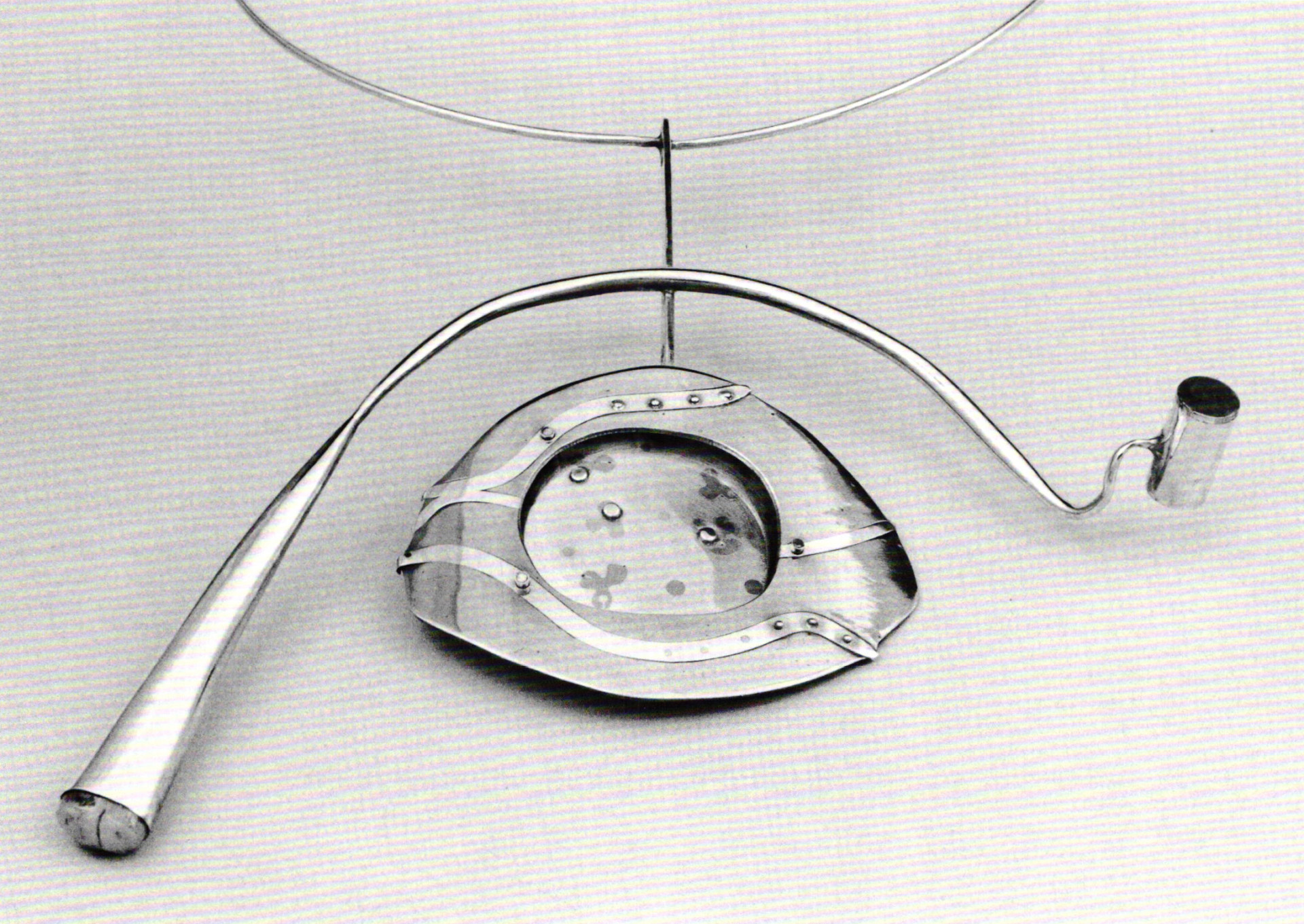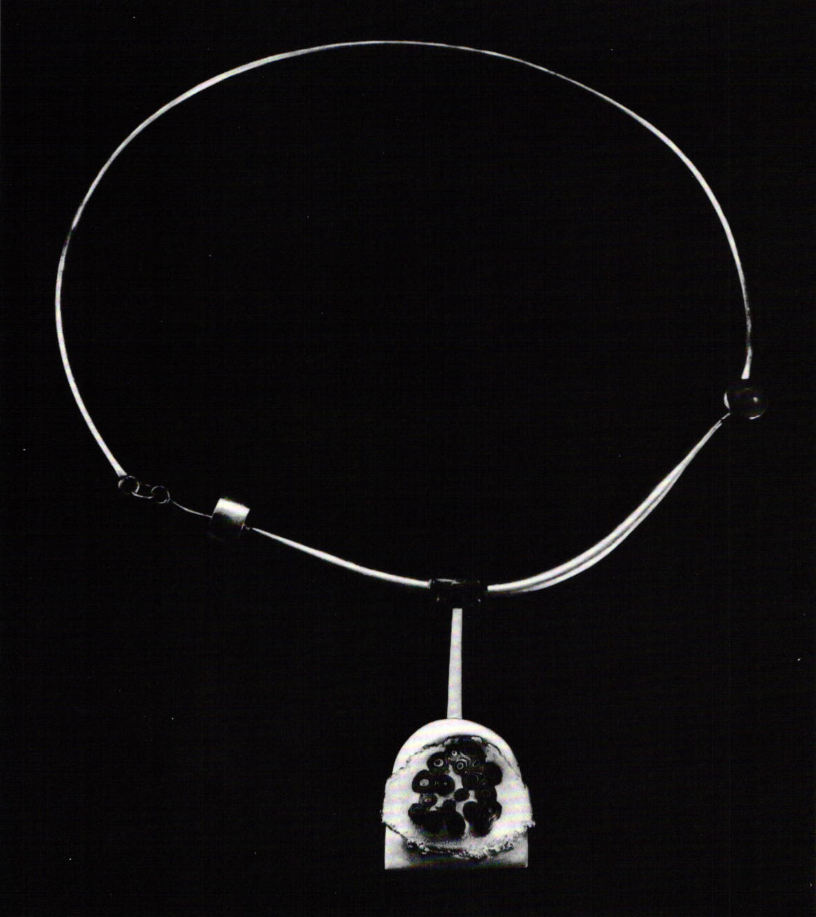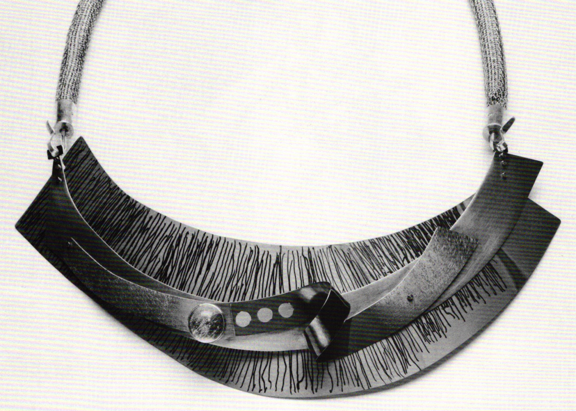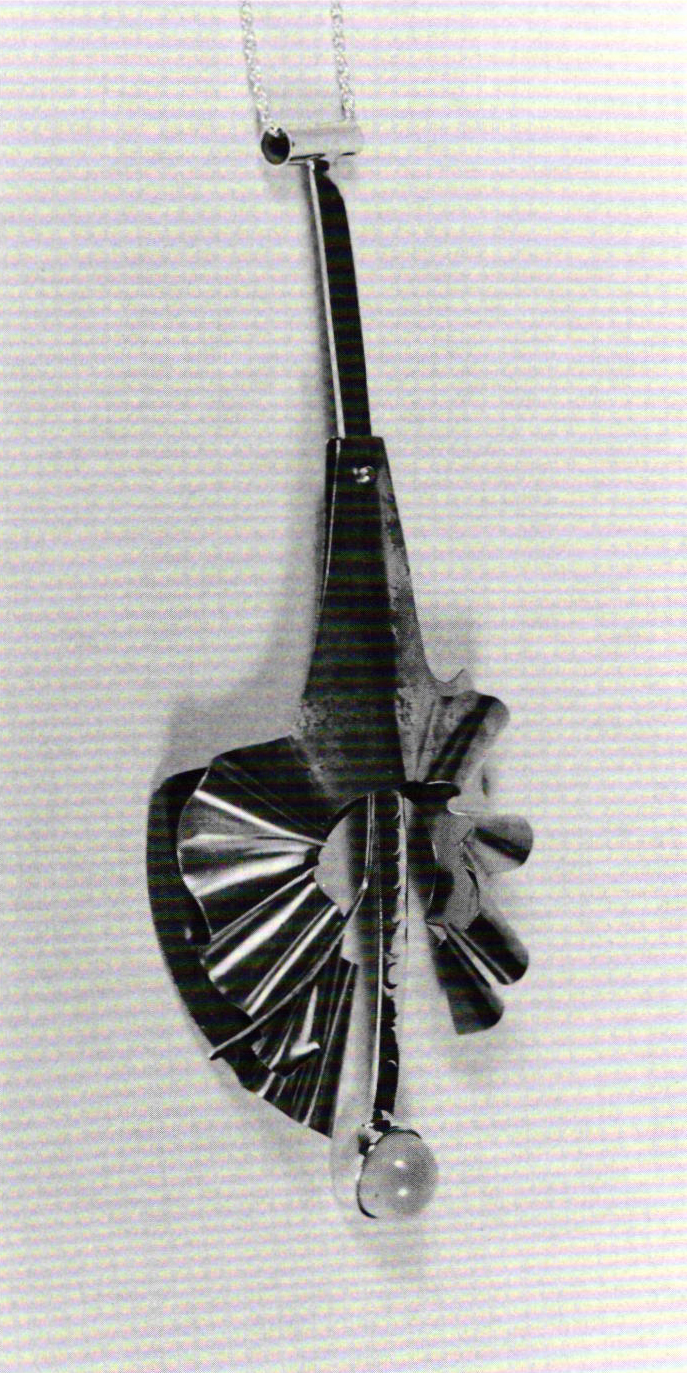 A pendant of 1979 contains a featured segment of contoured electro-mokume that has been embedded upon an abruptly terminated, elongated oval platform by electroforming, which she also uses to achieve volume and finish to its curving, irregular contours. A copper tube with a raised meander compliments the mokume, and the wire collar introduces a gently swelling curved segment between the moonstone and the related volume of a tubular form to emphasize the asymmetry of its dominant character.