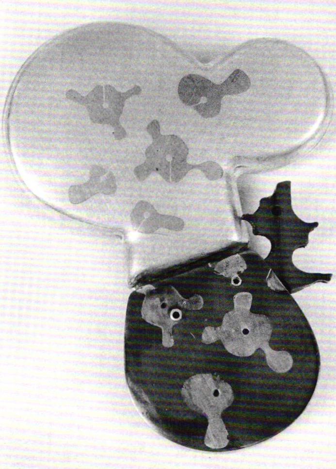 Other earlier methods combined lamination with casting as exemplified by a silver pin of 1962, where a detailed linear form was separated to create an expanded volume at each end, offering an enigmatic sense of organic growth. There is a duality of focus here that appears in other examples of her work, while the strength of its structure can be felt beneath the surface. Visual interest is also gained from the pattern of its cast shadow. Here the surface may predict the future use of the dot as it is combined with variant circular forms.