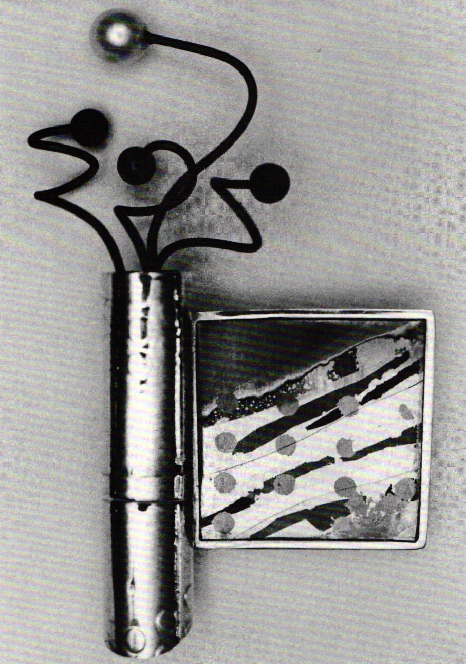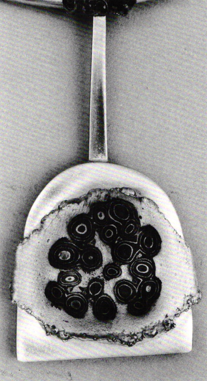 When mokume gane was brought to the attention of this country's metalworkers in the 70s, Florence Resnikoff felt challenged to master its technique. At first she achieved the "wood texture metal" effect by the traditional Japanese method, but soon concluded that bonding the thin layers of different metals by plating, would replace the tedious process of soldering. Its finely detailed, repetitive imagery of circular form and curvilinear pattern evoked an immediate response from Florence Resnikoff , as it related closely to an important aspect of her surface design.