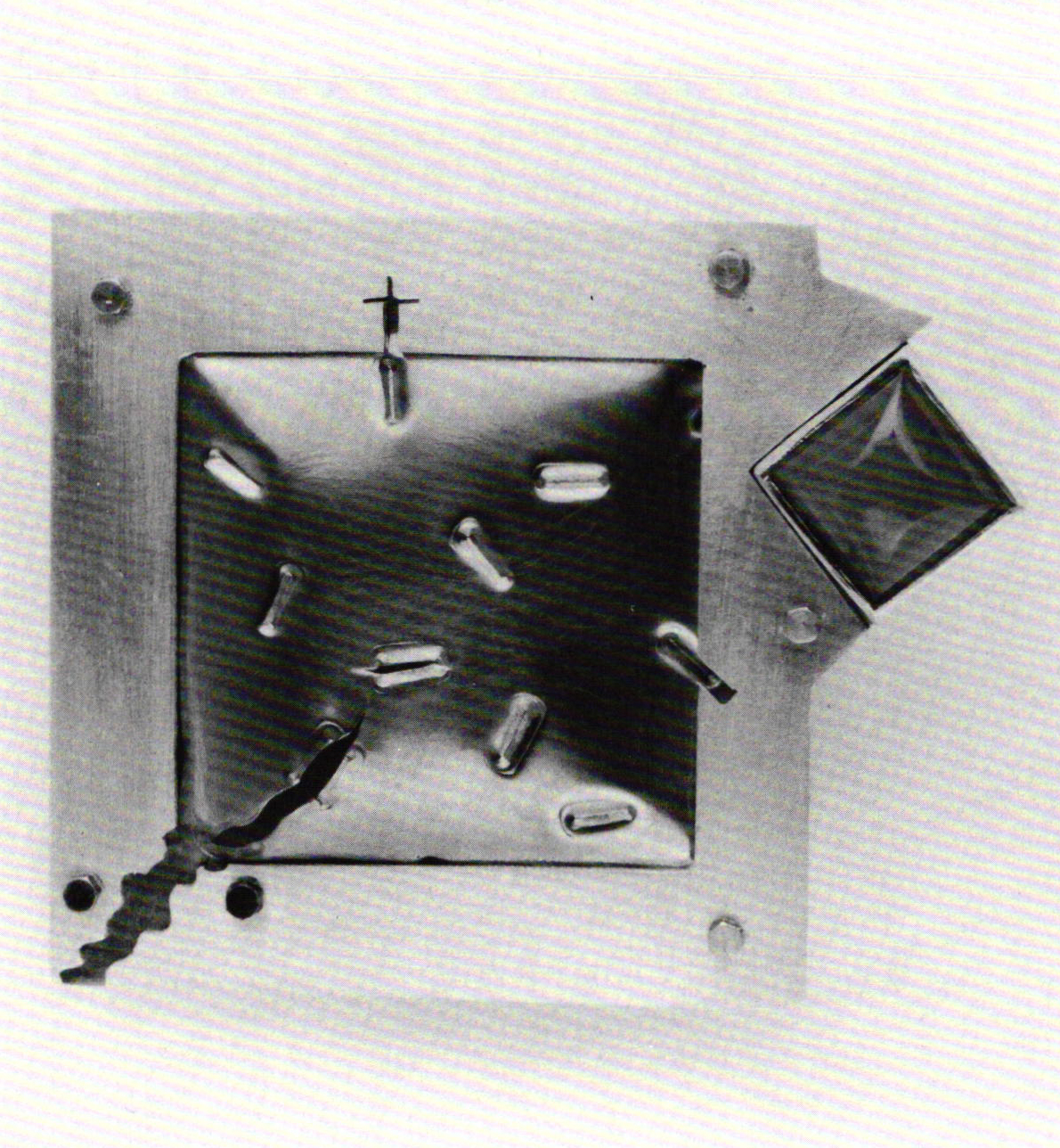 As Florence Resnikoff turned her attention toward the unification of dissimilar structural forms, many of the old design dictates of order, balance, harmony, for example, were replaced by eccentric focus and sudden juxtaposition. Not all the work of this time was charged with this level of energy. A respite is felt in a Marine Series of 1972, as Florence Resnikoff stepped back into traditional subject matter with forms that were extracted from nature and retold in a more rhythmic, but less gentle spirit. Out of this striking mélange of risky and demanding forms there emerged two modes —one tense, dynamic and expressive, and the other, static and measured in its post modernist sensibility. It is in this latter vein that some of the forms begin to explore industrial construction methods.