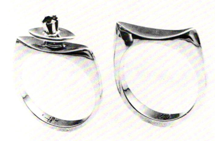 Relying primarily upon construction and casting, Florence Resnikoff 's earlier designs derived much of their character from the process and the palpable qualities of the metal. Although well defined, her designs often rejected the Spartan clarity of form that characterized so much of modernist thought, by her tendency to enrich surfaces with ornamental detail. Throughout the 50s and 60s, her cast pieces were generally executed with considerate restraint, as she avoided the beguiling excesses that often seemed to be inherent in the technique. The form of her rings and ring sets was fluid in transition, and many of them also gave a connotation of draped or folded fabric to the metal that relates to the character of the ribbonlike forms in her recent work.