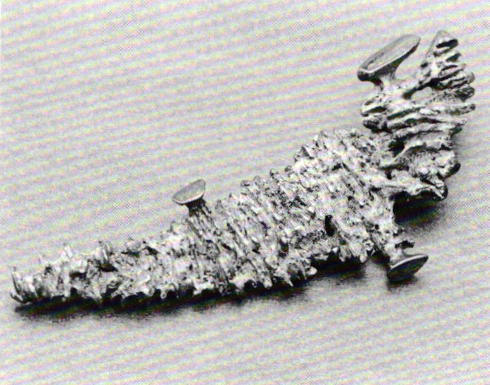 However, exuberance was sometimes allowed more expression where casting was the dominant procedure. Even so, the castings were conceived as contained masses, often of penetrated volume with textural contrast gained by richly patinated and polished surfaces. A cast pin of 1964 is among the most expressive and organic reaches of her work at this time. The attitude is one of arrested agitation in a form that is suggestive of nature's seemingly random and sometimes harsh sense of beauty.
