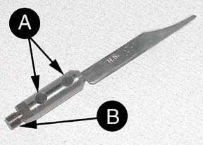 The graver holder adapter included in the kit is designed to accept modified gravers or other tools. The selected tool is placed into the adapter and the (A) allen screws are tightened. Then the adapter is screwed into the tip of the handpiece (B) and tightened with the supplied open-end wrench.